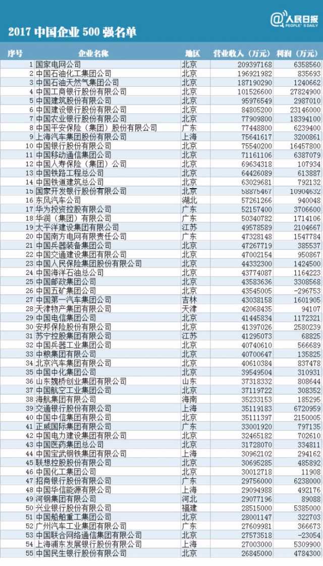 2017中國(guó)企業(yè)500強(qiáng)的營(yíng)業(yè)收入總額初次突破60萬(wàn)億元,達(dá)到了64.00萬(wàn)億元,相當(dāng)于去年我國(guó)GDP總額的86%。榜單上,營(yíng)業(yè)收入超過(guò)1000億元的共有157家,較上年增加5家,繼續(xù)擴(kuò)容。其中,國(guó)家電網(wǎng)公司成為中國(guó)唯一營(yíng)業(yè)收入超過(guò)2萬(wàn)億元的企業(yè),僅次于美國(guó)沃爾瑪,是世界第二大企業(yè)。