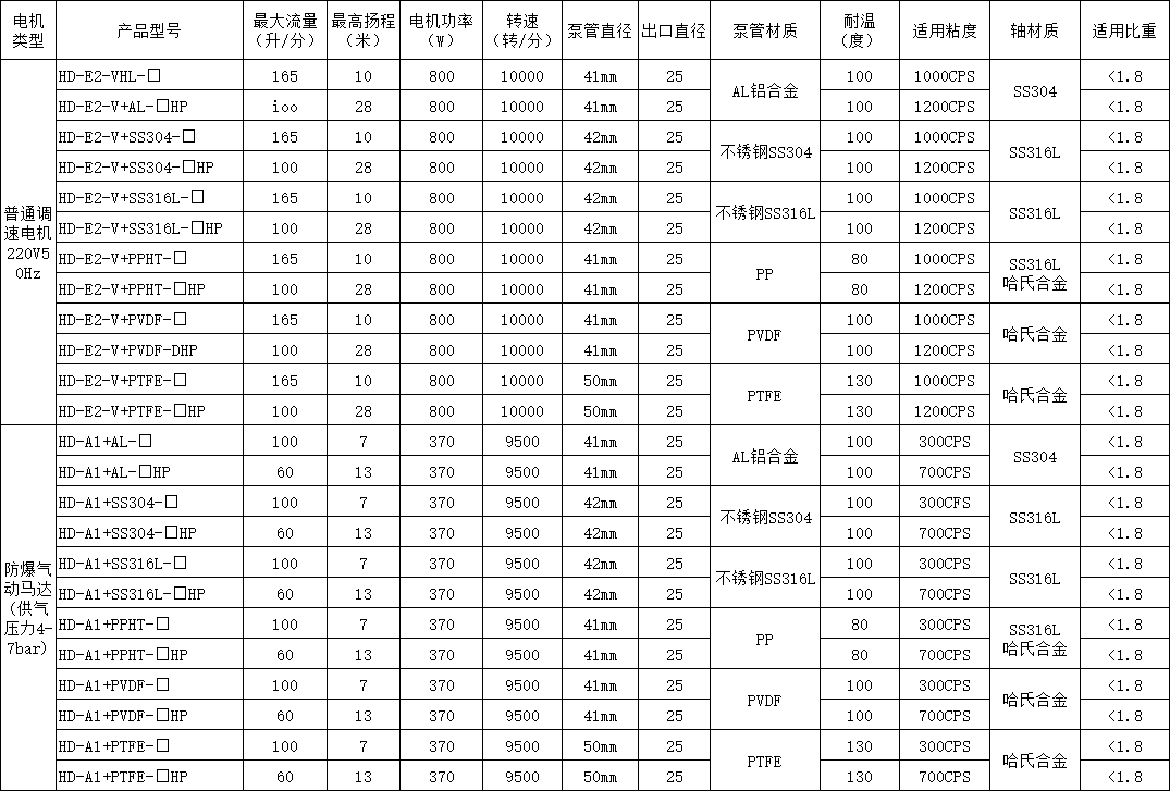 HD系列電動抽油泵根據所輸送的液體性質,泵體沾濕部分材料可選用鋁合金、優(yōu)質不銹鋼,增強聚丙烯等組成。驅動電機配備單相標準電機,防爆電機,高轉速電機等多種選擇。電機外殼采用優(yōu)質PC聚碳合成塑料,根據所配置泵體材質和電機的不同,型號可分為三大系列10種型號,該系列泵可按防爆區(qū)域和非防爆區(qū)域選用,如在易燃易場合使用,可選用我公司生產的防爆型電動抽液泵。使用防爆型電動抽液泵時應正確使用防爆插頭插座。RPP塑料:非較性、無污染、有耐酸堿鹽類等腐蝕性化學液體。工作溫度:-14~100℃。